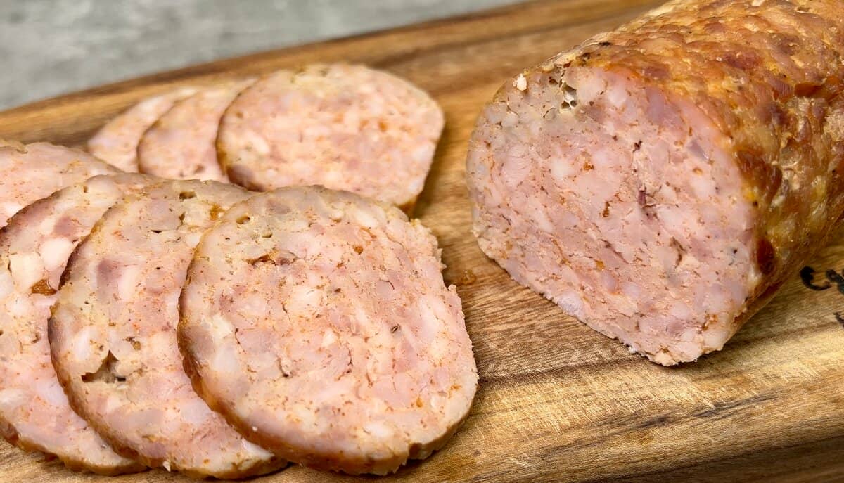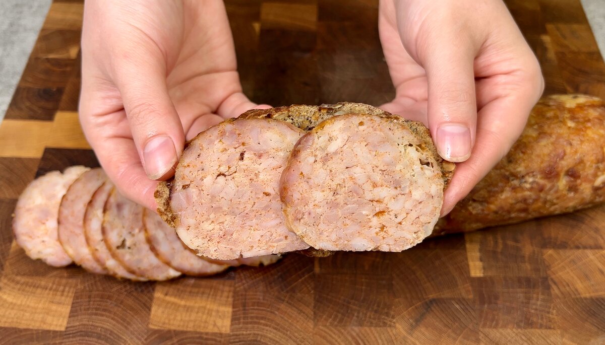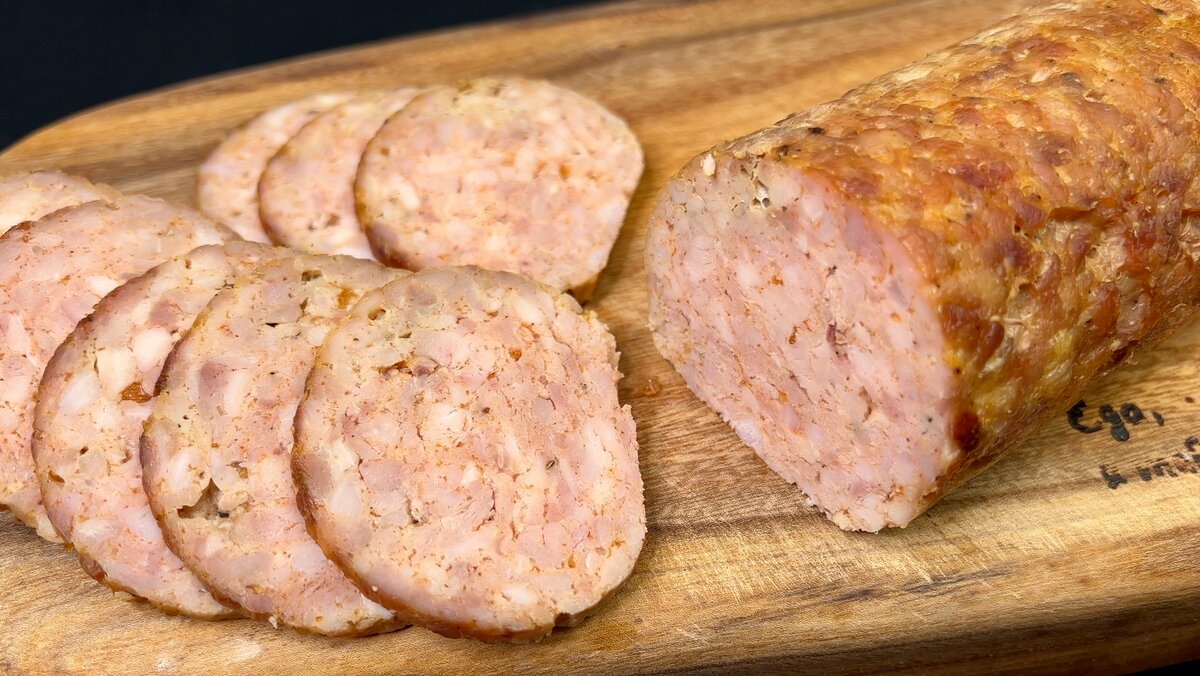 Це один з наших улюблених сімейних рецептів. Все максимально просто, швидко і без всяких проблем. А результат при всій простоті завжди чудовий! Така ковбаса хороша на будь-який випадок: до сніданку, на перекус, і, навіть, як святкова нарізочка!