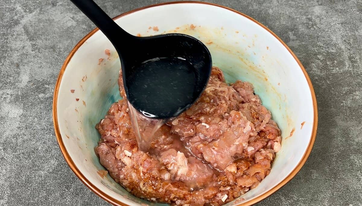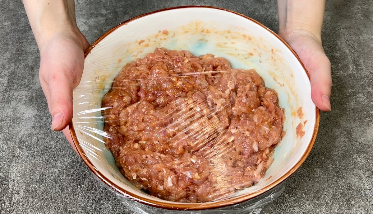 4. До фаршу вливаємо остиглий бульйон, ще раз ретельно все перемішуємо, накриваємо харчовою плівкою і прибираємо в холодильник на 6-8 годин.
