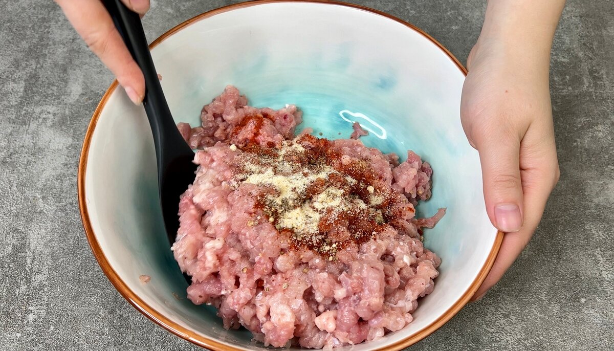 3. М’ясо від стегенець пропускаємо через м’ясорубку, додаємо солодку паприку, мелений коріандр, сушений часник, сіль, чорний мелений перець і гарненько все перемішуємо.