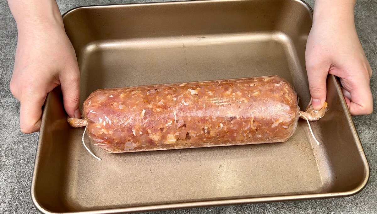 5. Викладаємо фарш на розрізаний рукав для запікання, надаємо форму ковбаси і зав’язуємо “цукерку” шпагатом з двох сторін.
