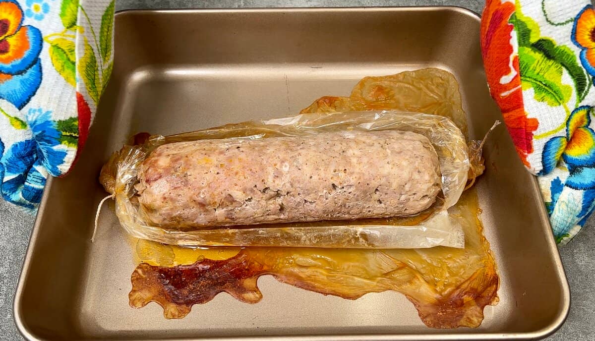 6. Перекладаємо ковбасу на деко і відправляємо в розігріту до 180 градусів духовку рівно на 1 годину.