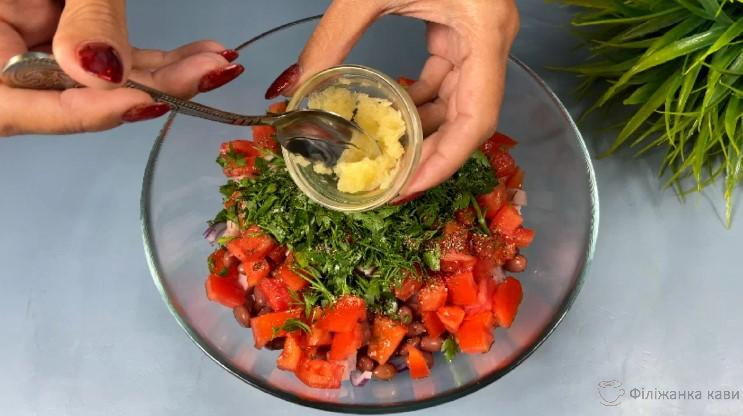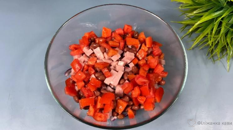 3. Далі додаємо шинку нарізану дрібним кубиком, чотири столові ложки консервованої квасолі та дрібно нарізані помідори.