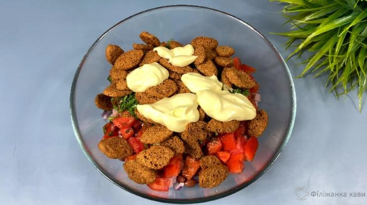 5. Висипаємо зверху пачку сухариків зі смаком бекону, додаємо майонез, добре перемішуємо і наш салат готовий.