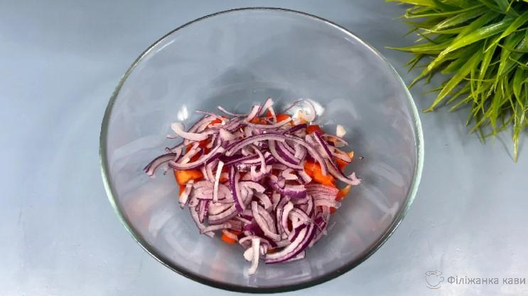2. Червону салатну цибулю нарізаємо півкільцями і додаємо до перцю.