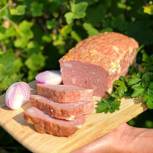 Перекласти фарш у змащену хлібну форму Л-7, ретельно утрамбовуючи, щоб не було порожнеч, округлити верх. Змастити злегка збитим курячим білком, відправити в духовку на годину при темп. 100-110 ° С, потім додати до 130 ° С і тримати ще 50-55 хв.