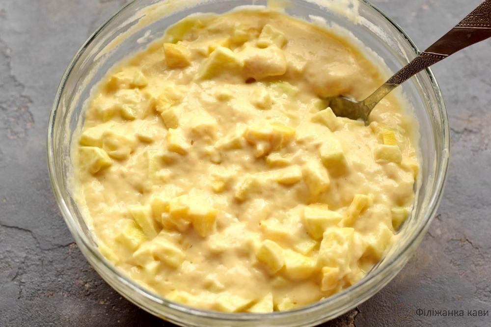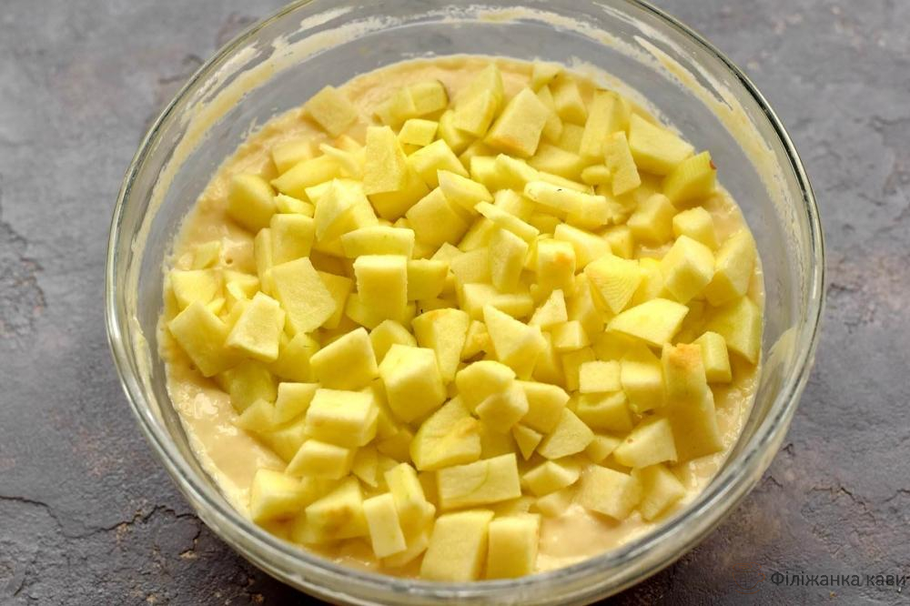 - Яблука очистіть від шкірки, видаліть серцевину, м’якоть наріжте дрібним кубиком, закиньте в тісто.