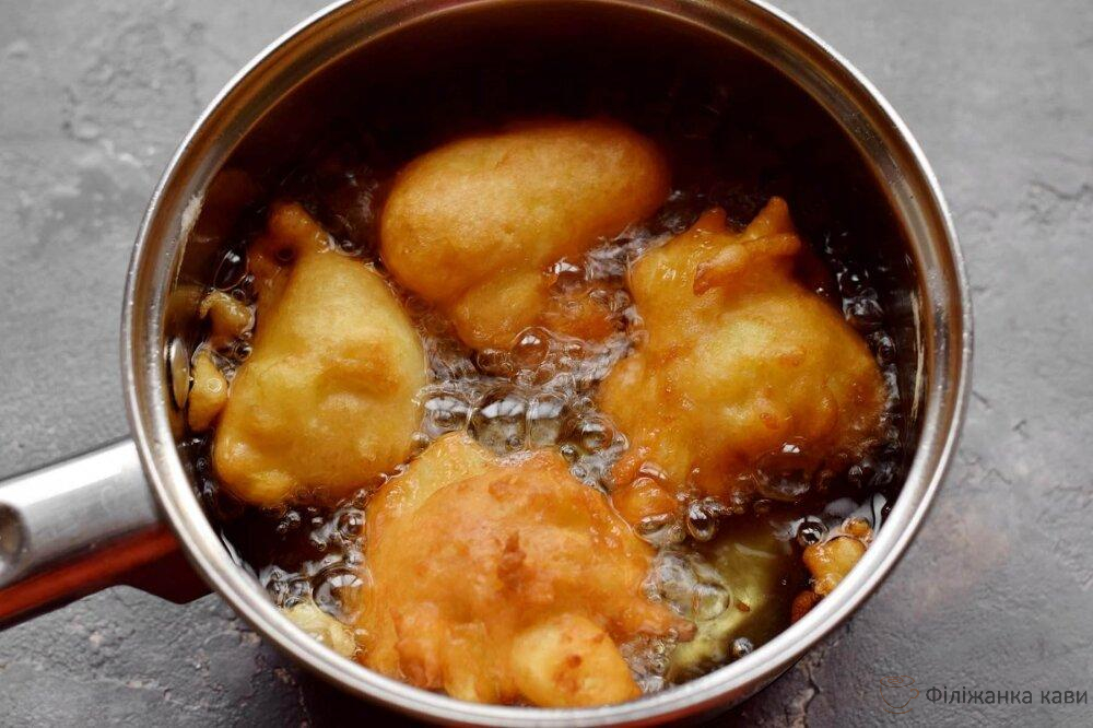 - У сотейник влийте велику кількість олії, нагрійтеїї до гарячого стану. Столовою ложкою набирайте невелику порцію суміші і відпустіть її в олію. Смажте пончики на середньому вогні приблизно 2 хвилини, перевертаючи їх в різні боки для рівномірного просмаження.