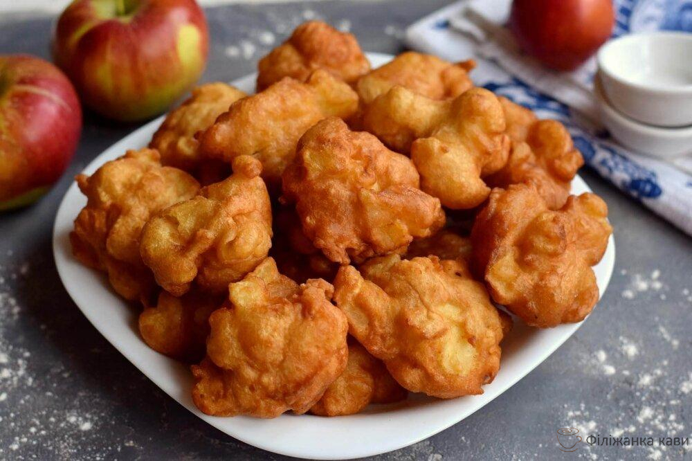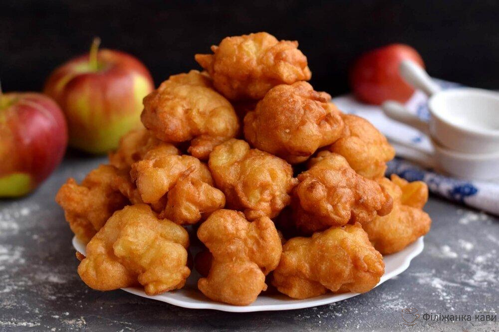 Вироби смажаться у фритюрі, при цьому виходять абсолютно не жирними. Яблука всередині перетворюються в ніжний яблучний крем, його кислинка відмінно доповнює солодке тісто. Такі пончики з фруктовим смаком і ароматом набагато цікавіше звичайних оладок.