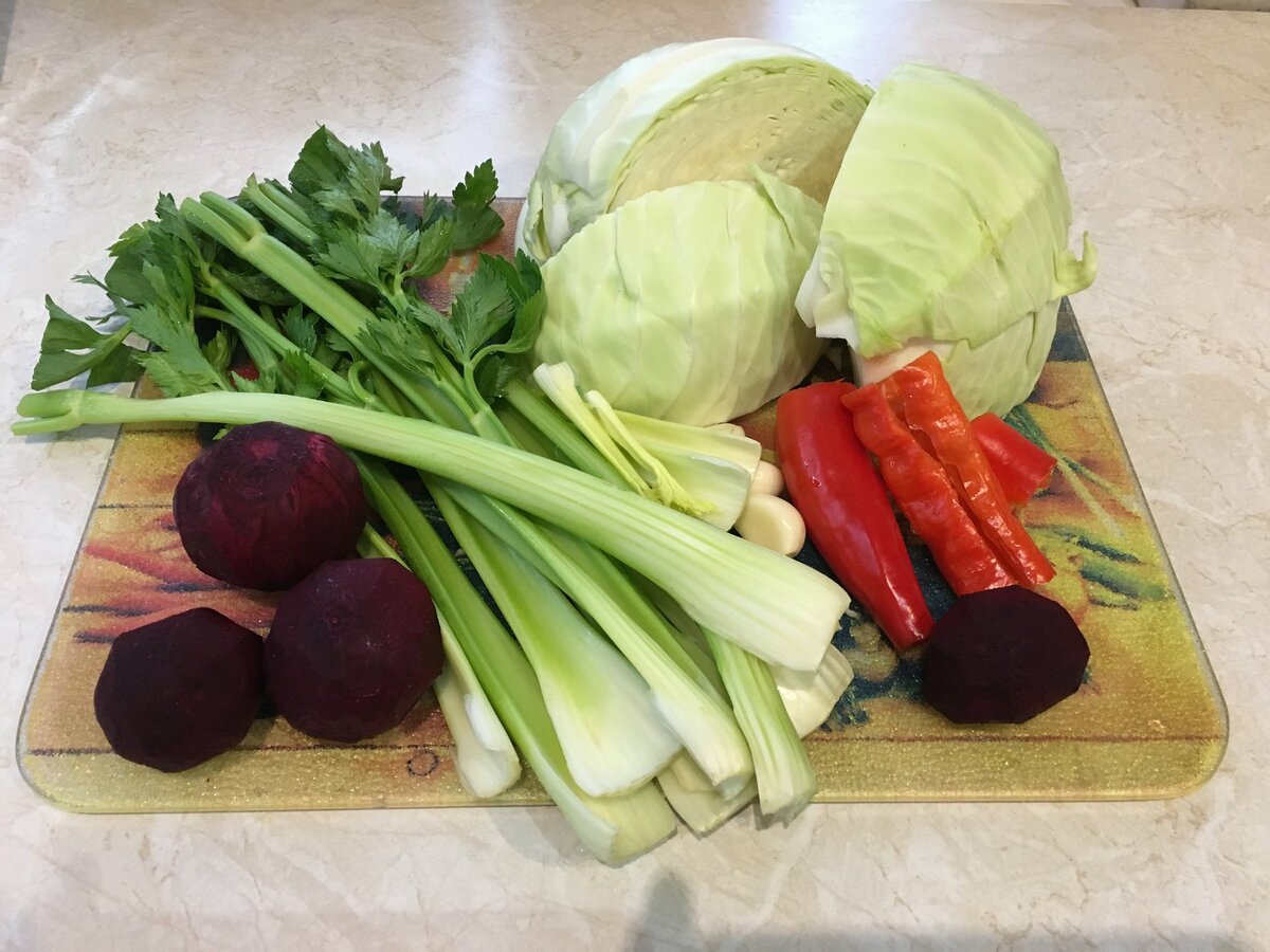 Скляні банки ( або керамічний посуд за Вашим бажанням ) я мию і ошпарюю окропом. Нарізаю капусту довільно, як вийде. Буряк і селеру ( попередньо його почистила від грубих прожилок ) теж порізала, як вийшло.