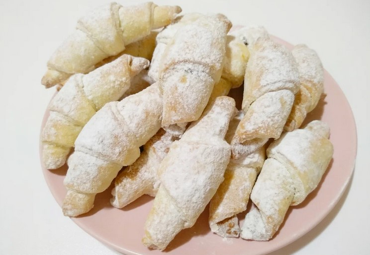 10. Готові рогалики дістаємо з духовки, даємо трохи охолонути і гарячими обвалюємо у цукровій пудрі.