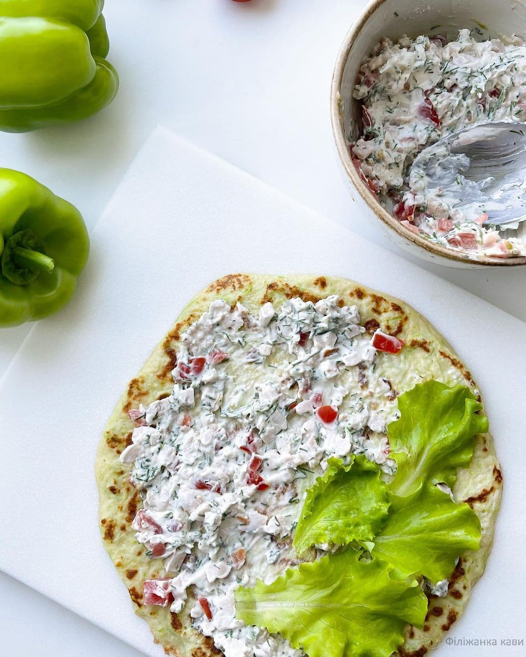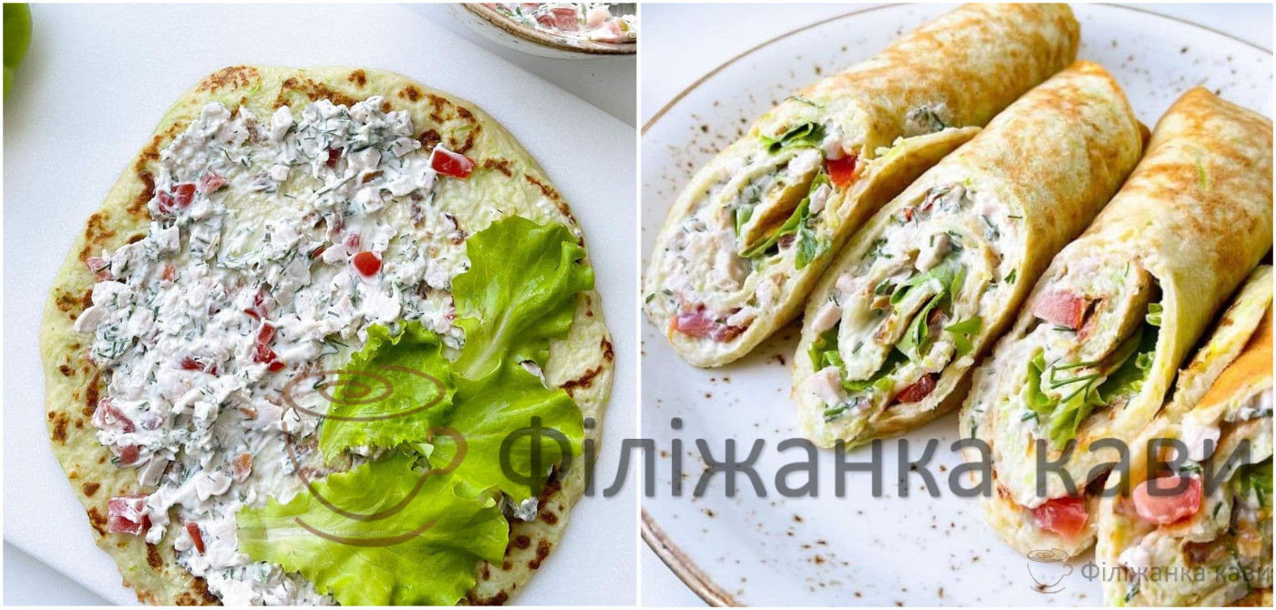- Змастити млинець начинкою, можна додати листя салату.