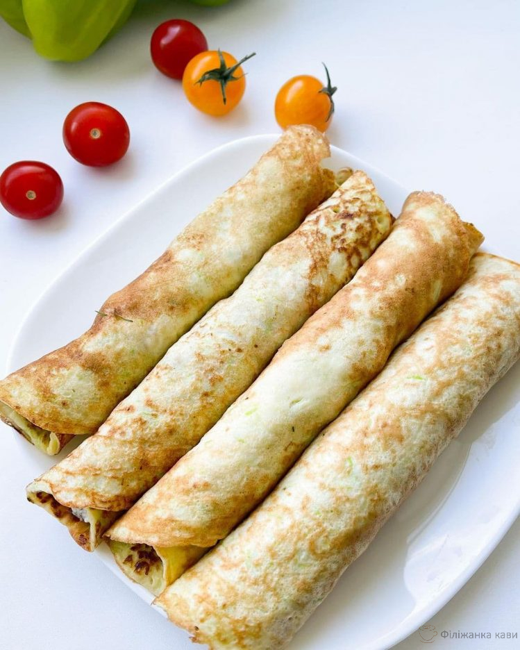 - Спочатку потрібно приготувати кабачкові млинці. Для цього натерти кабачок на дрібній тертці, посолити, дати пару хвилин постояти, відтиснути зайву рідину. Додати молоко, яйця, борошно, сіль та спеції. Добре перемішати і на розігрітій сковороді підсмажити млинці. Вийде 4 штуки діаметром 24 см.