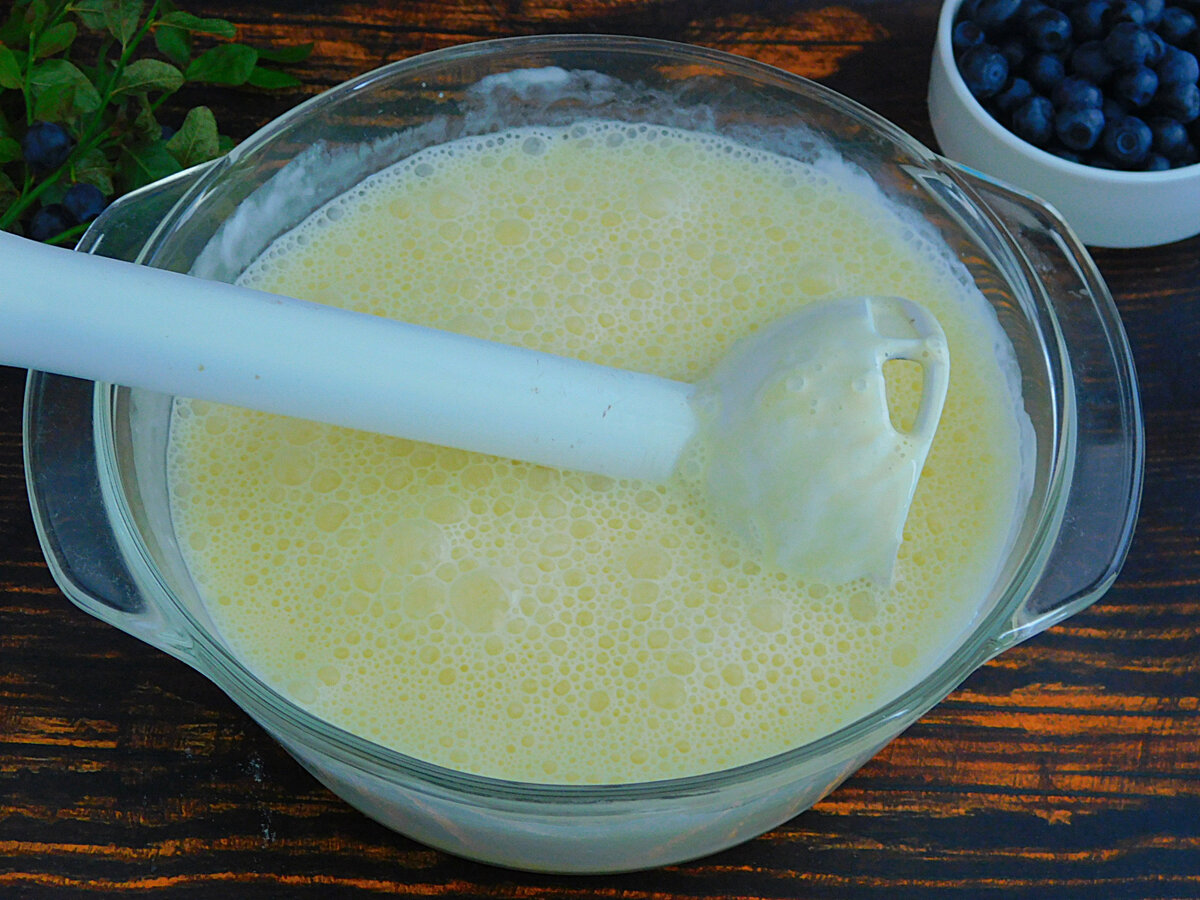 5. Для заливки з’єднати сметану, яйця, цукор і кукурудзяний крохмаль. Пробити погружним блендером до рідкої маси, поки не розчиняться цукрові крупинки.