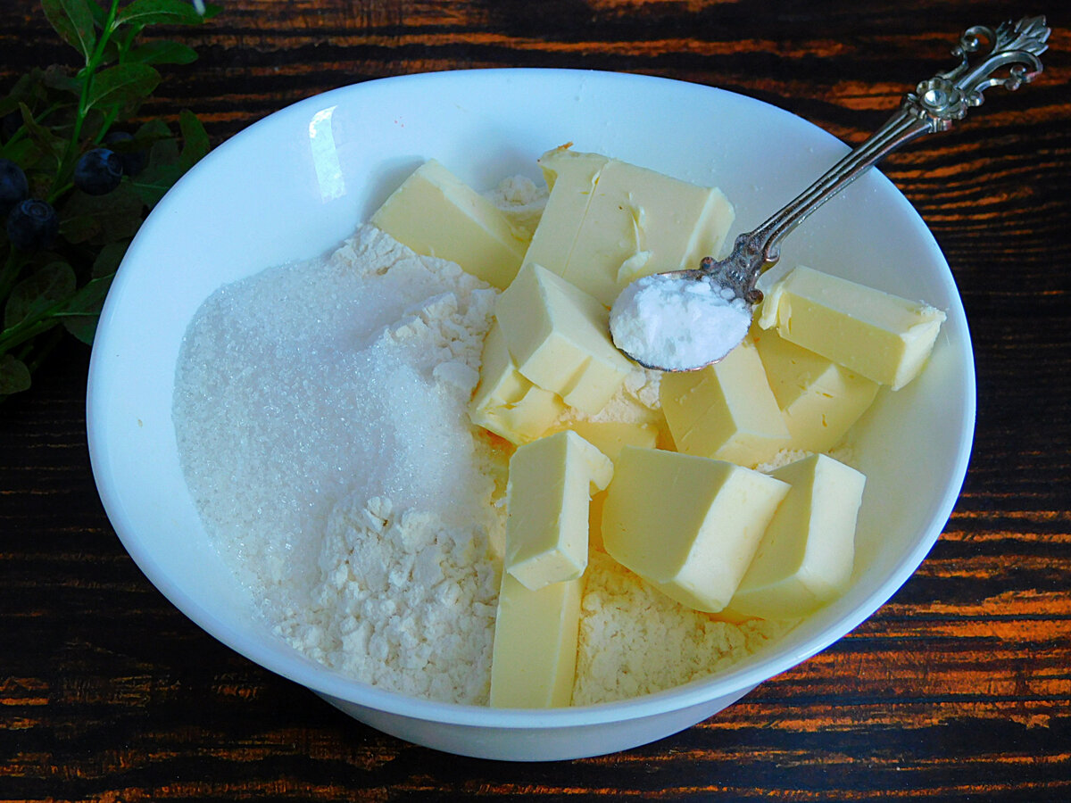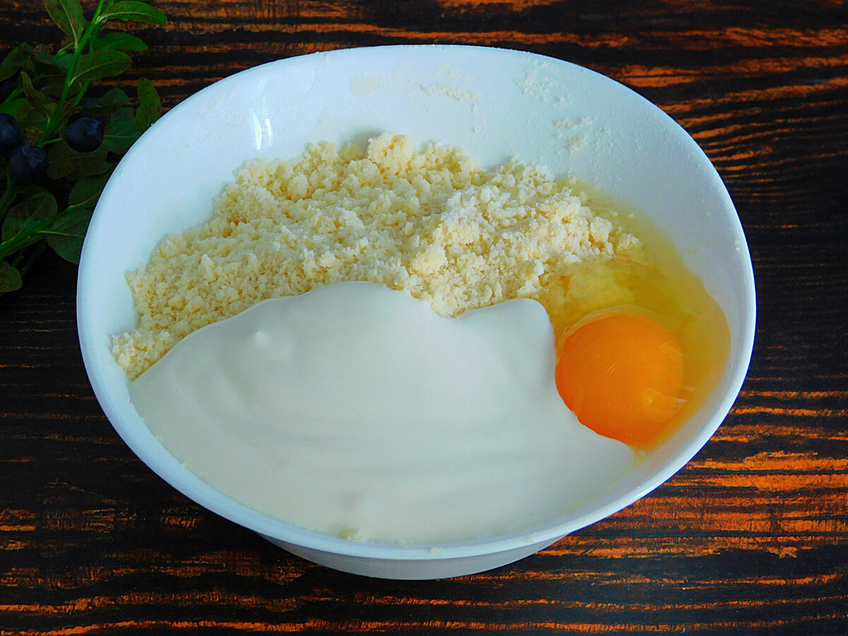 2. Спочатку зайнятися тістом. У миску помістити борошно, цукор, сіль, холодне вершкове масло і розпушувач. Порубати інгредієнти ножем або перетерти пальцями в дрібну крихту. Додати яйце і сметану.