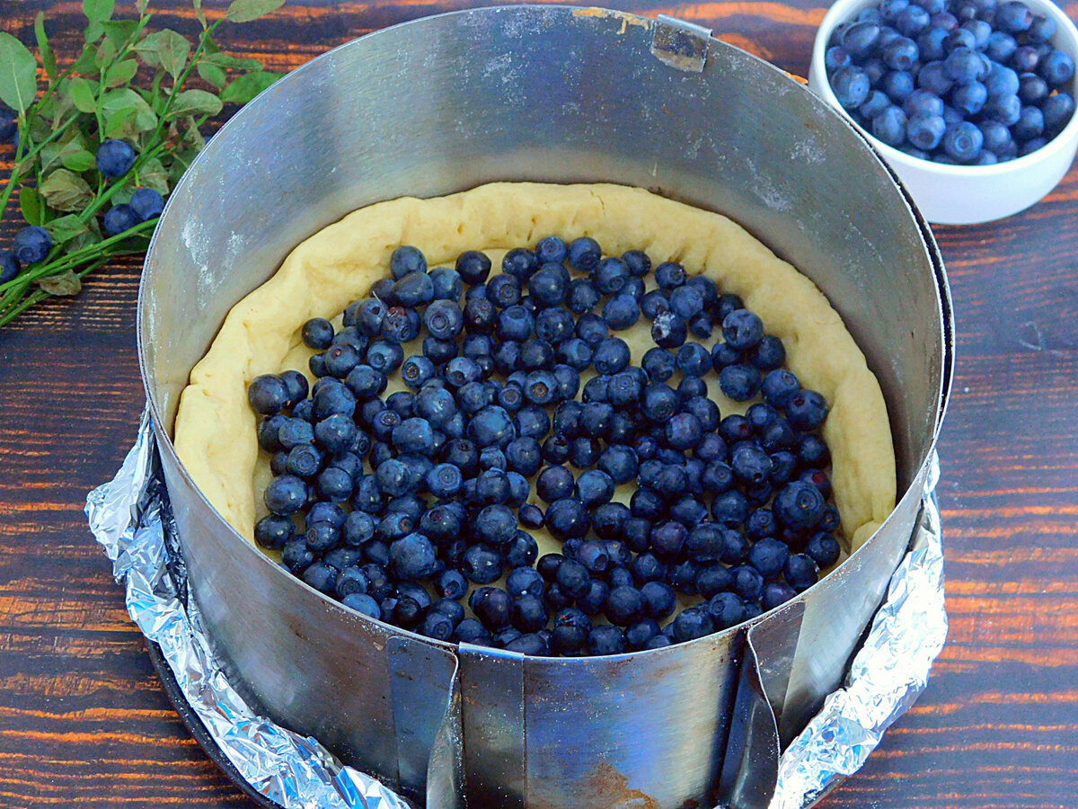 6. Дістати корж і висипати ягоди чорниці. Попередньо їх помити і дати обсохнути, щоб прибрати вологу.