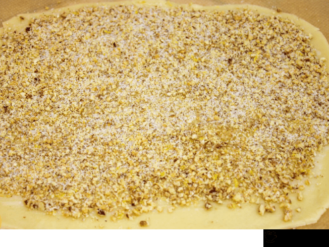 Кожну частину тіста розкачати на пергаменті в тонкий прямокутний пласт, товщиною приблизно 3 мл. Тісто змастити білком, рівномірно розподілити горіхову начинку (начинку розділити навпіл).