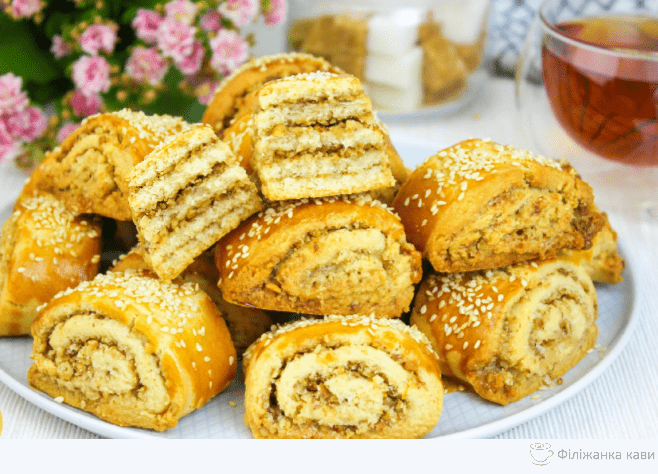 Викладаємо на деко застелене пергаментом або килимком для випічки. Змастити жовтком і посипати кунжутом. Випікати в заздалегідь розігрітій духовці за температури 190 градусів до золотистого кольору, приблизно 25 хвилин. Готове печиво викладаємо на решітку і даємо охолонути.