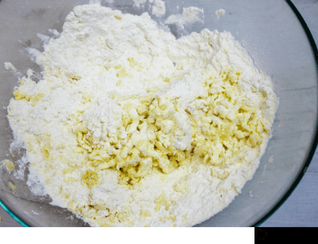 Приготувати тісто. У миску просіяти борошно, додати розпушувач, сіль, перемішати вінчиком. У борошно натерти на великій тертці холодне вершкове масло.