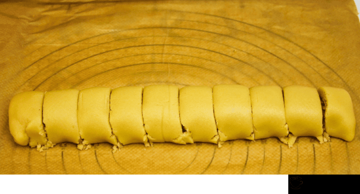 Згорнути тісто в щільний рулет. Розрізати на рівні частини по 3 см. (Рулет 10 шт).