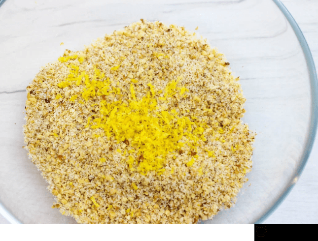 Приготувати начинку. Горіхи та цукор подрібнити блендером у дрібну крихту. Додати цедру лимона, перемішати.