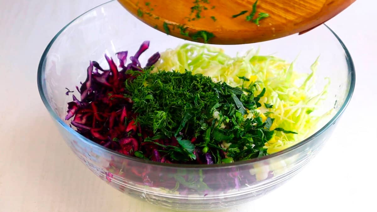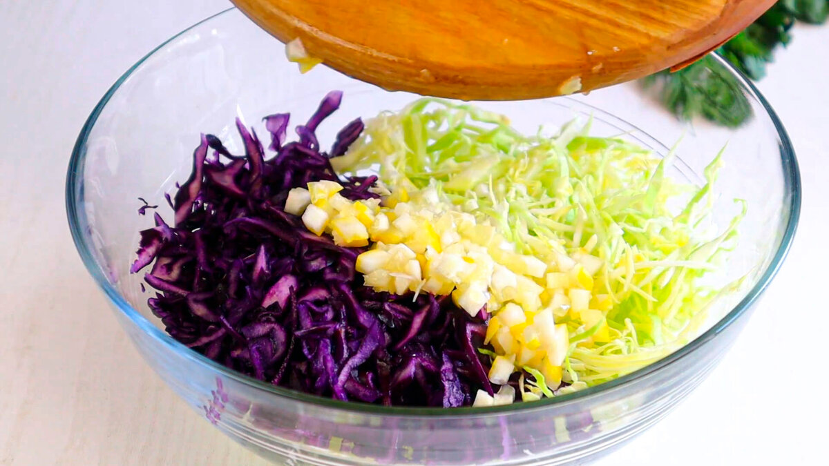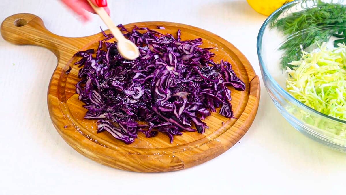 Далі нарізаємо червонокочанну капусту, трохи солимо і руками трохи пом’яти її. Викладаємо в миску.