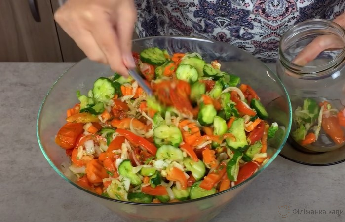 Накриваємо салат і залишаємо на 3 години, періодично перемішуємо.