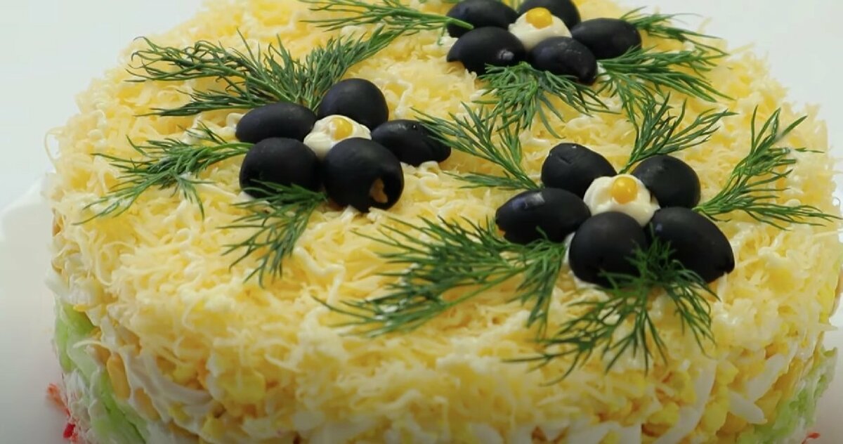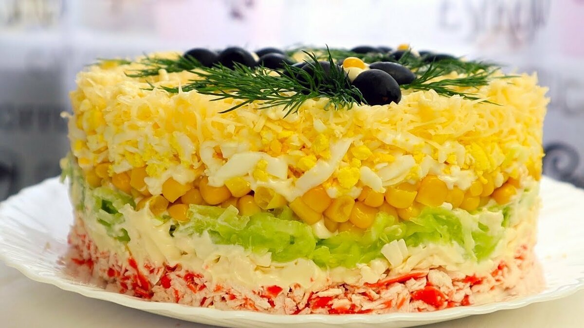 Сьогодні готуємо крабовий салат з кукурудзою по-новому! Салат шарами виходить дуже ніжним завдяки тому, що більшість продуктів натираються на терці. Такий варіант для багатьох стане краще, ніж звичний крабовий салат.