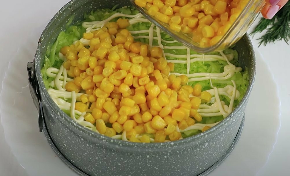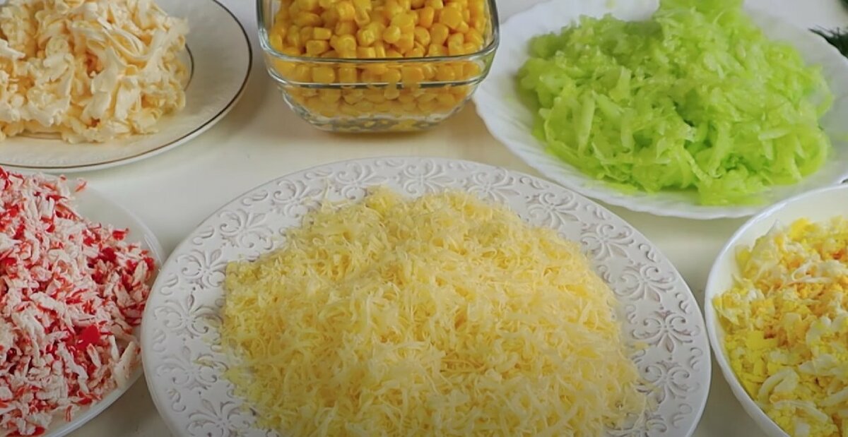 Як вже говорилося вище, всі продукти, крім кукурудзи, натираємо на терці. Яйця заздалегідь відварюємо, сирок злегка підморожуємо, з огірка знімаємо шкурку і прибираємо насіння.