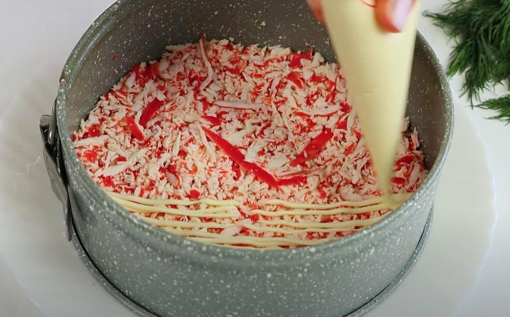 Перший шар – крабові палички і майонез, який будемо змащувати кожен шар салату.