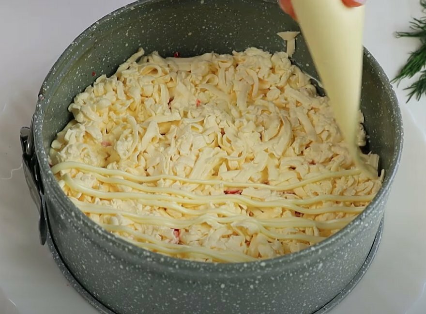 На завершення, накриємо салат шаром тертого сиру і прикрасимо маслинами і гілочками кропу.
