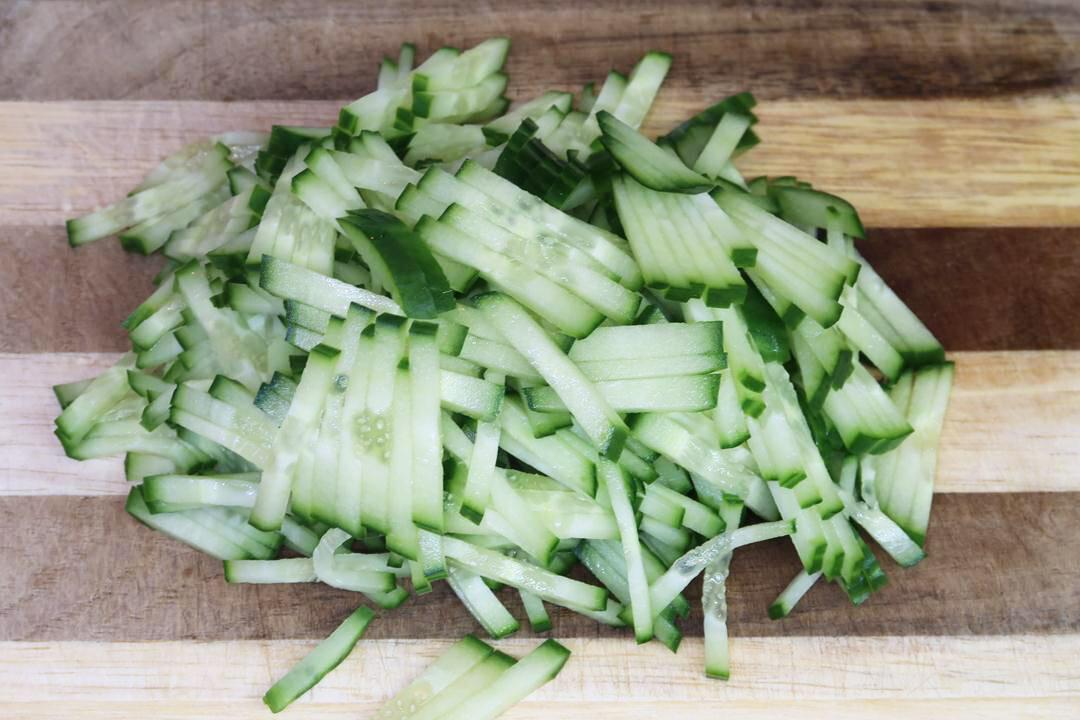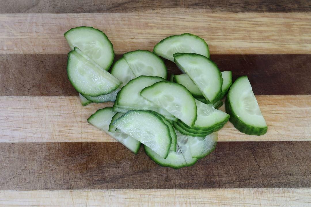 Настала черга для прикраси. Половину свіжого огірка, яку ми залишили для прикраси, нарізаємо тонкими півкільцями.
