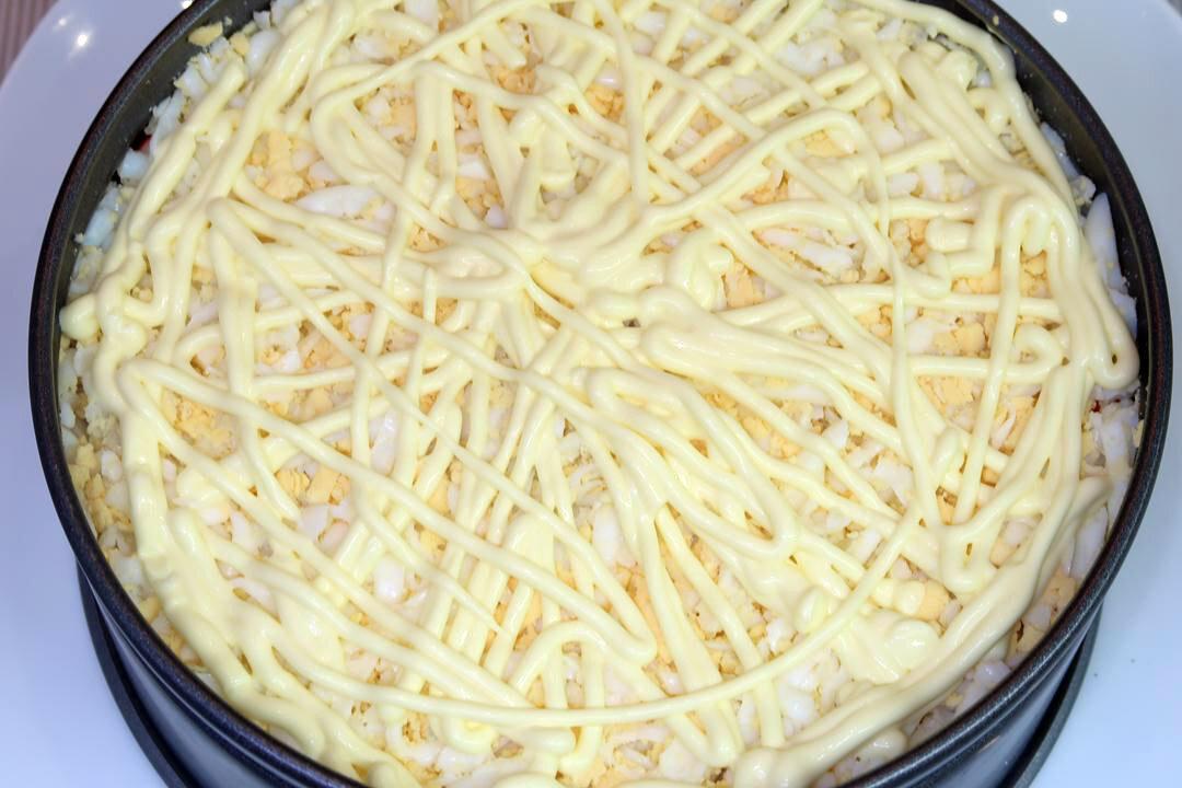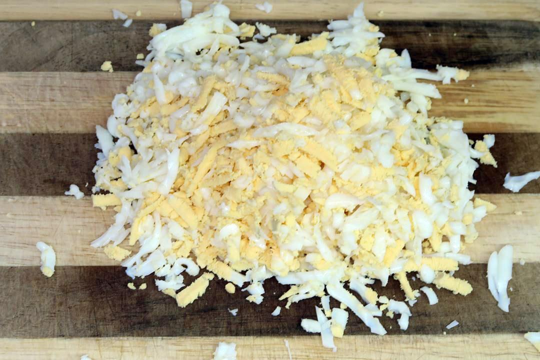 Відварні яйця натираємо на великій терці і викладаємо шостим шаром. Завершальний яєчний шар змащуємо щільніше майонезом.