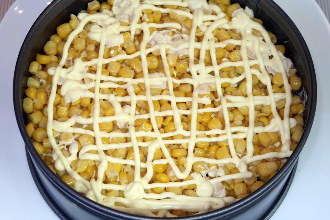 Четвертим шаром викладаємо консервовану кукурудзу і рівномірно розподіляємо по всій поверхні форми. Зверху робимо сітку з майонезу.