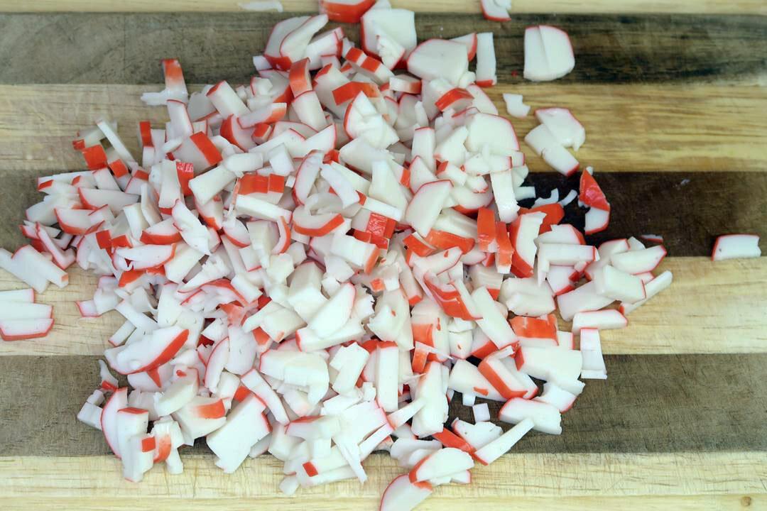 Крабові палички нарізаємо невеликими шматочками і викладаємо п’ятим шаром. Зверху робимо сітку з майонезу.