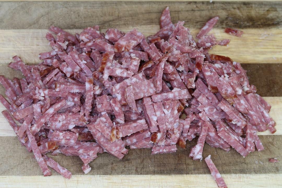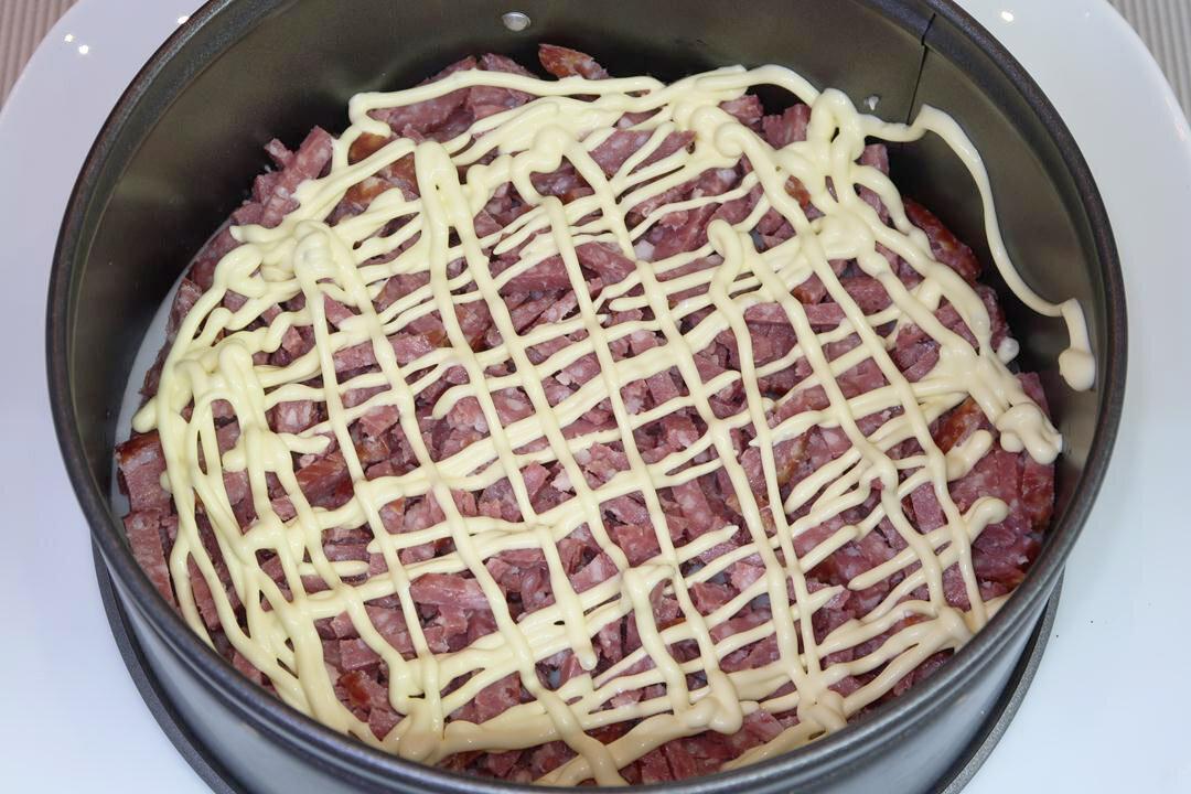 Салат будемо викладати шарами на плоскій тарілці за допомогою кільця від форми для випічки. Розмір кільця 18 см в діаметрі. Копчену ковбасу нарізаємо соломкою і викладаємо першим шаром. Зверху робимо сітку з майонезу.