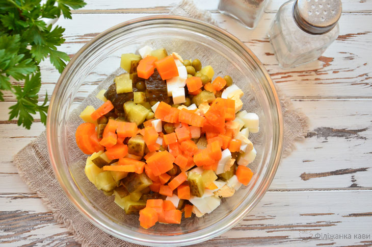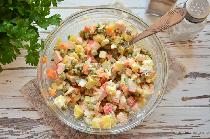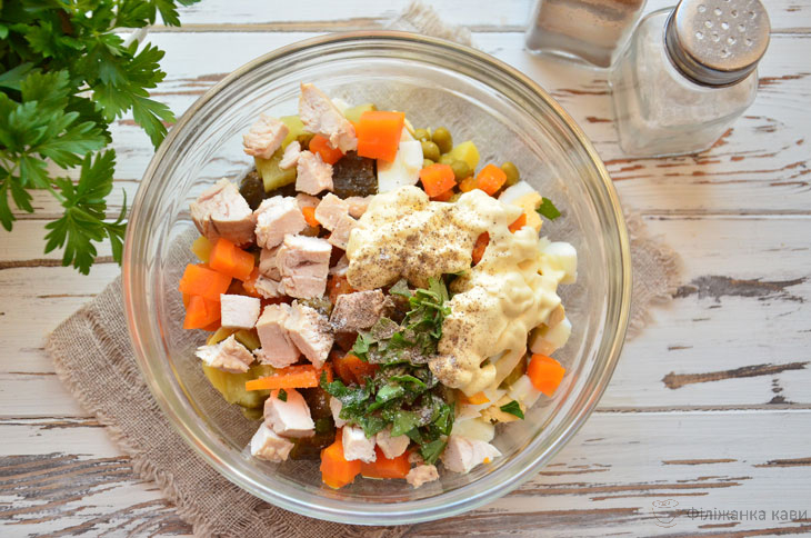 7. Підсоліть салат і додайте спеції, заправте майонезом або інший заправкою.