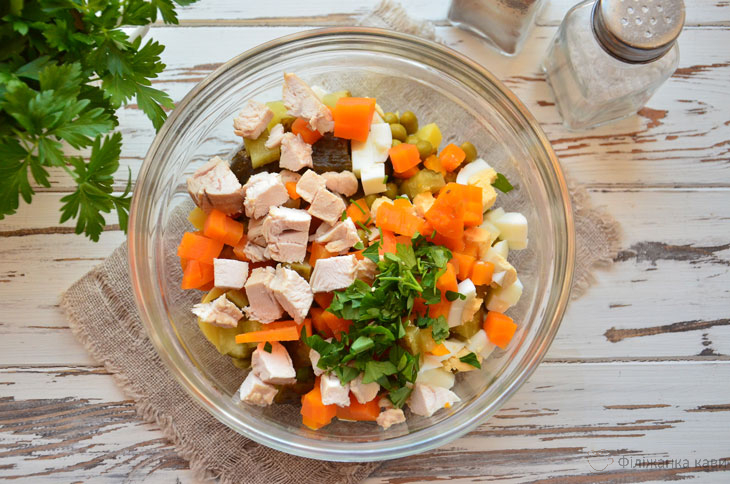 6. Варену курку наріжте невеликими шматочками, відправте в миску разом з рубаною петрушкою.