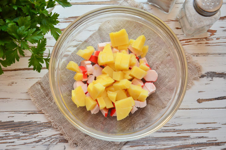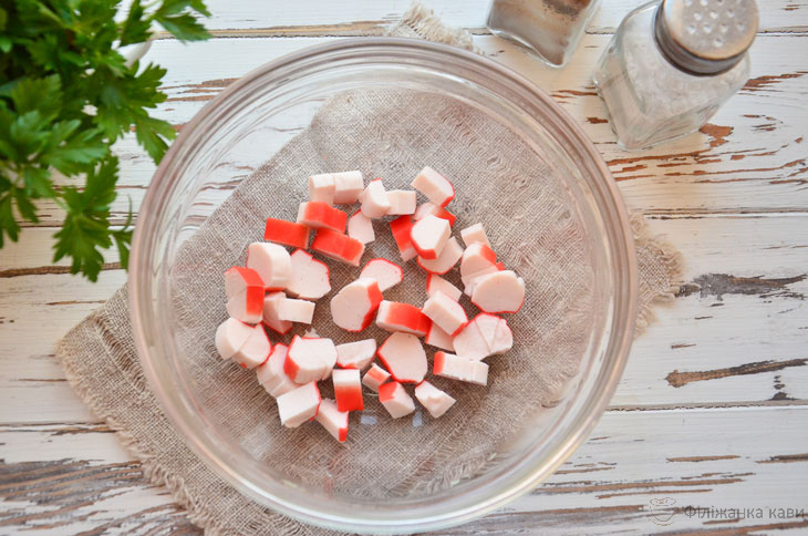1. Крабові палички можна купити охолоджені. Заморожений продукт необхідно розморозити при кімнатній температурі. Після звільніть палички від целофанової оболонки, дрібно порубати і покладіть в глибокий салатник.