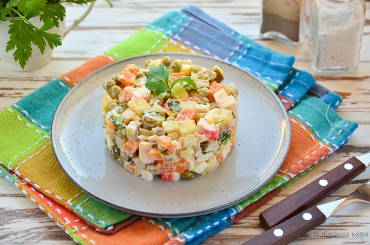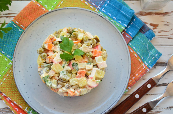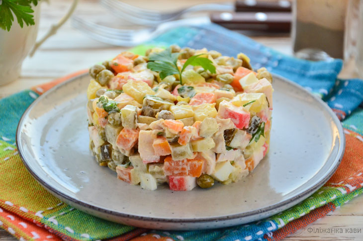 Салат Столичний з куркою і крабовими паличками за складом дуже нагадує популярну класичну страву, однак, є очевидні відмінності. Готується страва просто, незважаючи на те, що список складових не так вже й малий.