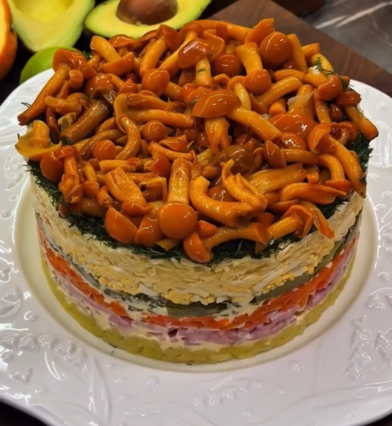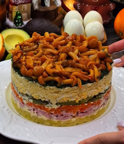 Минулого року ми ставили схожий салат на стіл, називався «грибна галявина», але там були ще обсмажені печериці з цибулею, а замість шинки – відварена грудка – теж смачний варіант 🔥але цей перевершив всі!