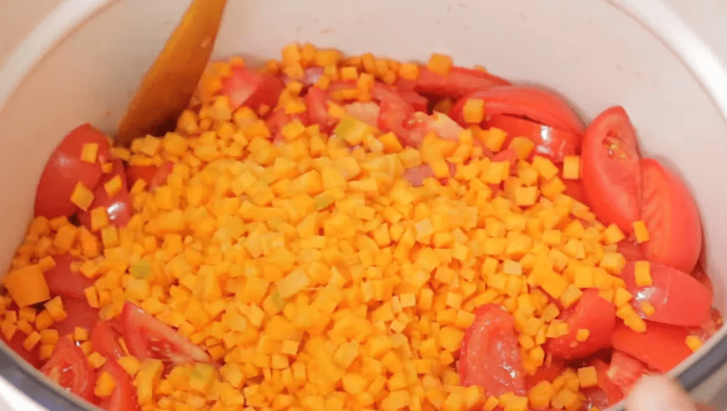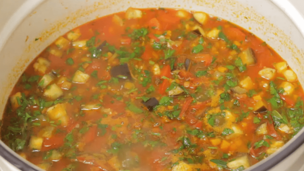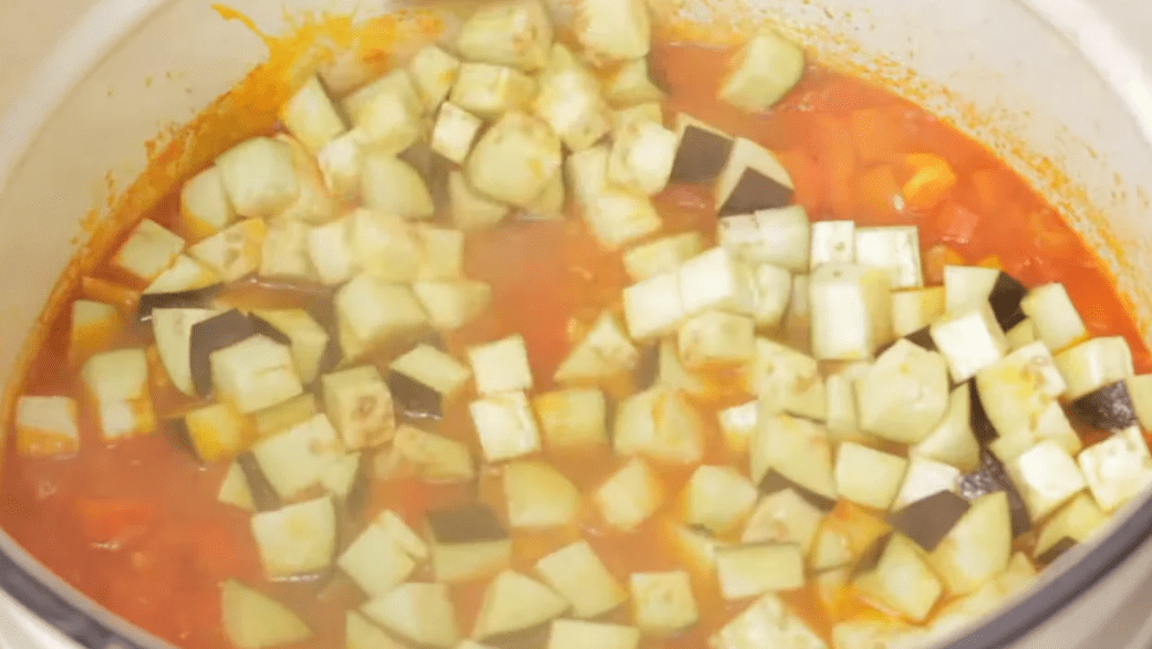 Через 20 хвилин додати солодкий перець, баклажани і довести до кипіння.