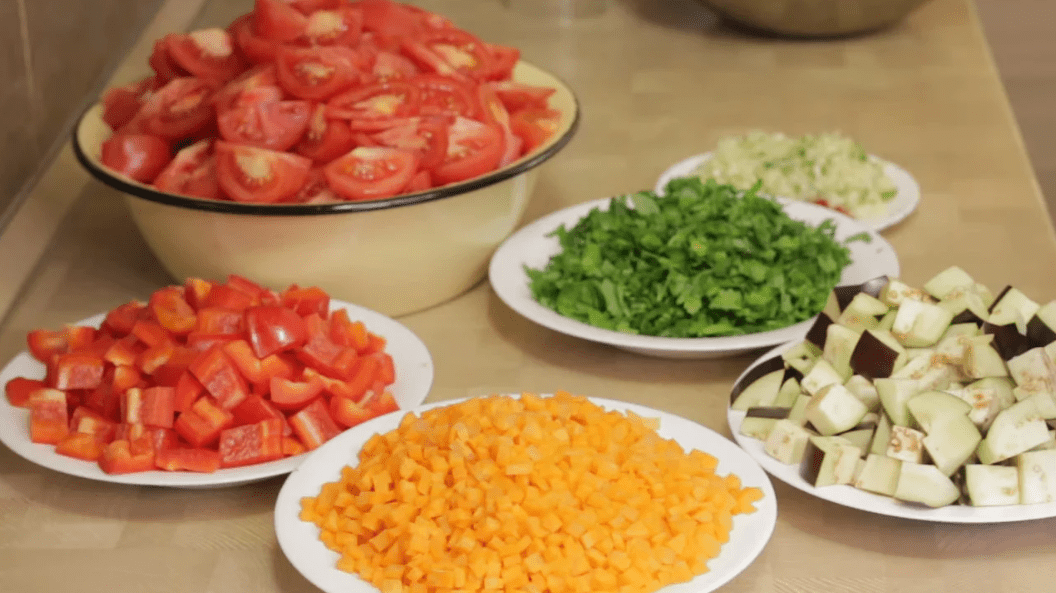 Помідори потрібно нарізати часточками або ж кубиком, як інші інгредієнти. Всі інші овочі – кубиком.