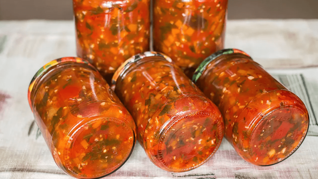 Розкласти салат по банках, банки закрити стерильними кришками та одразу перевернути. Зберігається заготівля при кімнатній температурі.