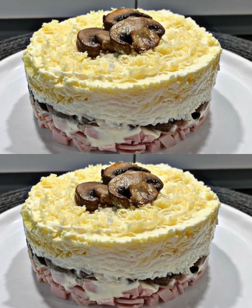 ☑️Першим шаром йде куряче філе + сіточка з майонезу.