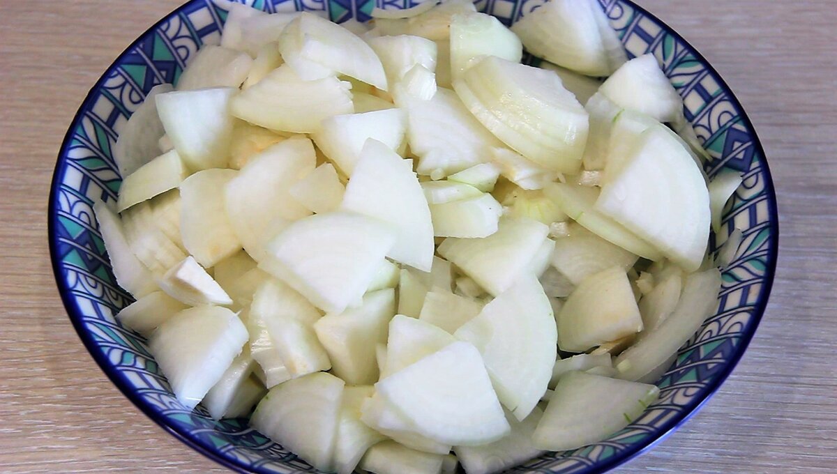Наріжте півкільцями ріпчасту цибулю. Для любителів гострих закусок можна додати гострий перчик.