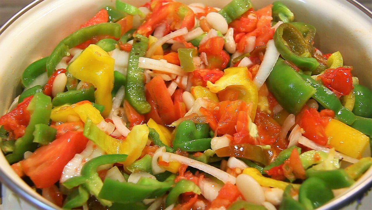 У каструлю складіть відразу всі овочі ( помідори, цибуля, болгарський перець ) і заздалегідь підготовлену квасоля. Проваріть все на повільному вогні приблизно 30 хвилин, періодично помішуючи. Час приготування може бути різним, головне щоб квасолю не розварити і залишилася в цілому вигляді.