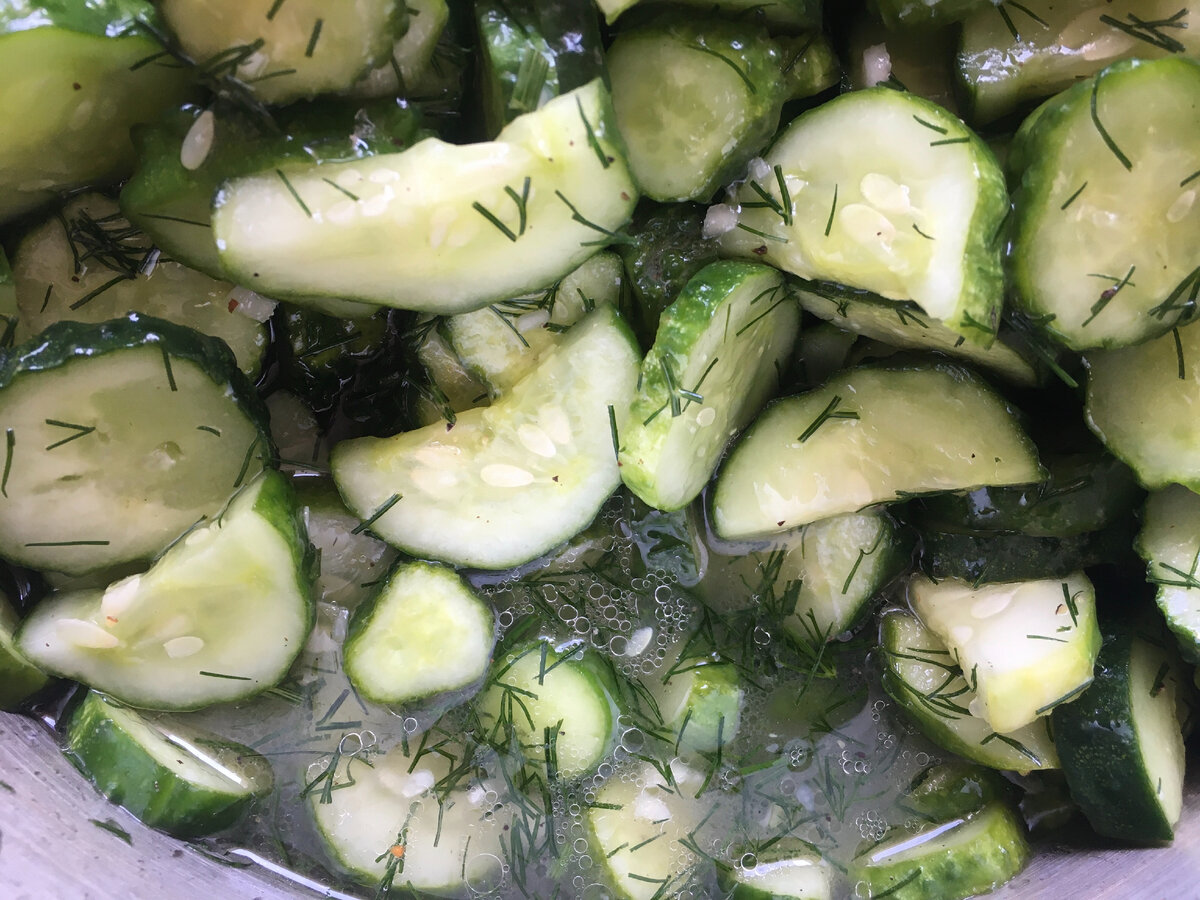 Тобто з 1 кг огірків виходить приблизно 1 літр салату або трохи більше. Я не рекомендую наповнювати банки “під зав’язку”: при стерилізації розсіл може при кипінні витікати з переповнених банок.