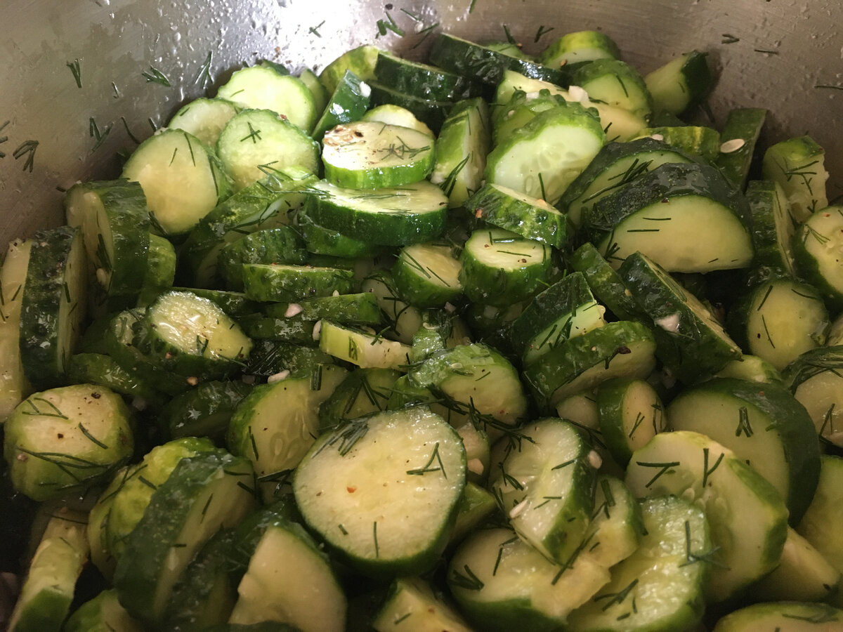 Складаю огірки в каструлю і додаю всі інші інгредієнти салату. Перемішую все ретельно і залишаю на столі на кілька годин.