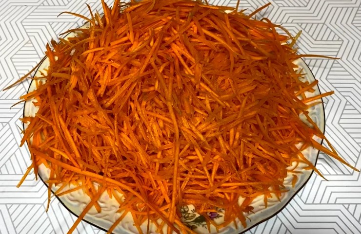 - Крім того, 0,5 кг моркви потрібно очистити, вимити та натерти довгою соломкою. Для цього я використовую терку для моркви по-корейськи. Ще можна скористатися овочечисткою.