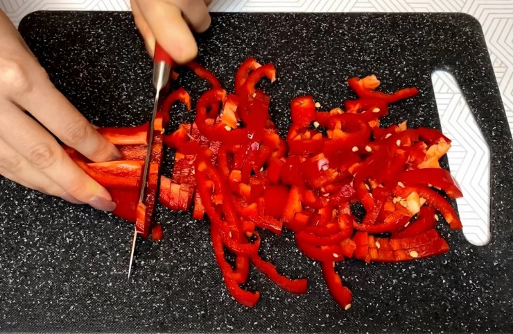 - Тепер ділимо перці на половинки та нарізаємо такою соломкою: